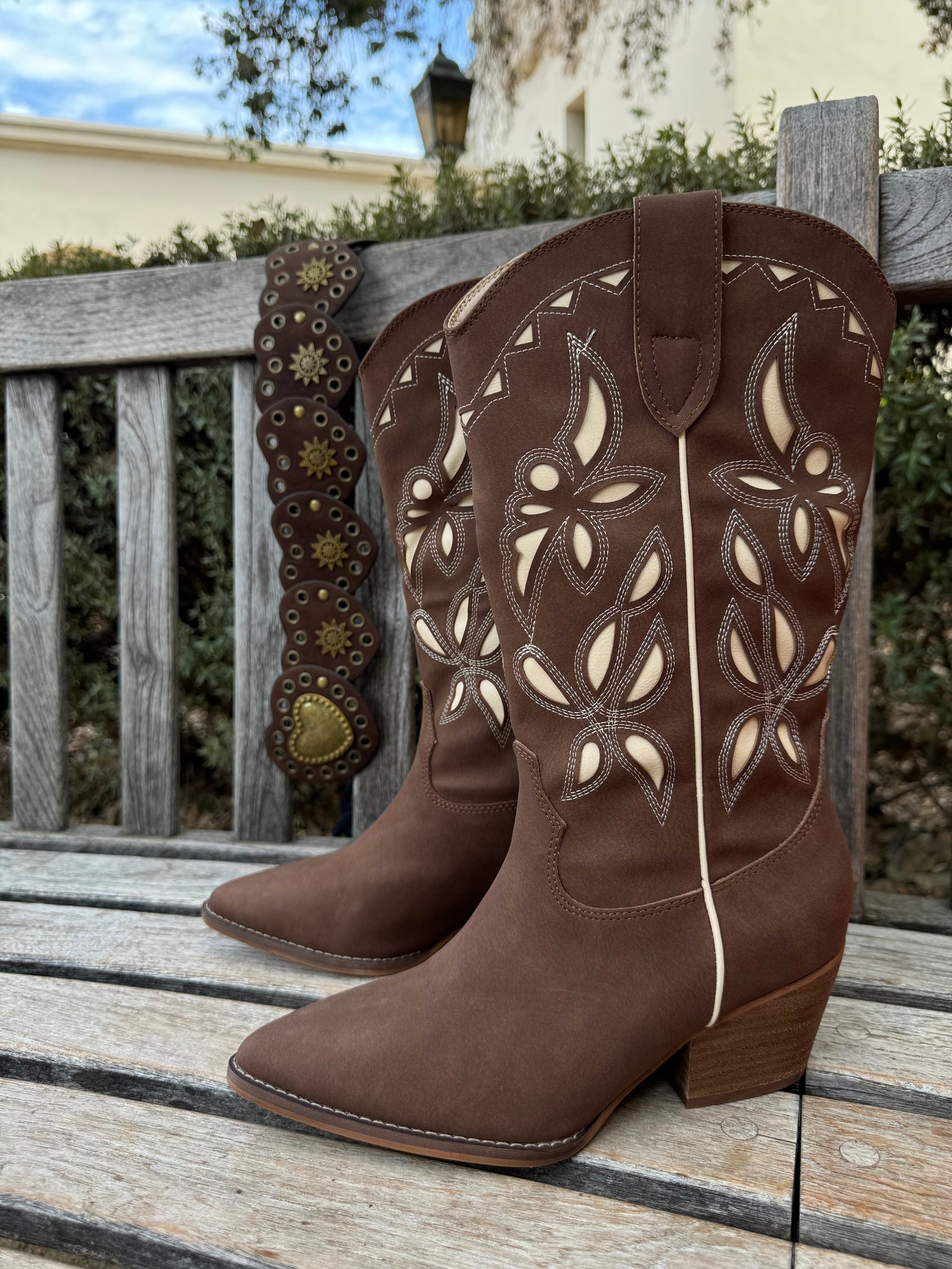 Our Herencia western boots feature stunning layered laser-cut panels.