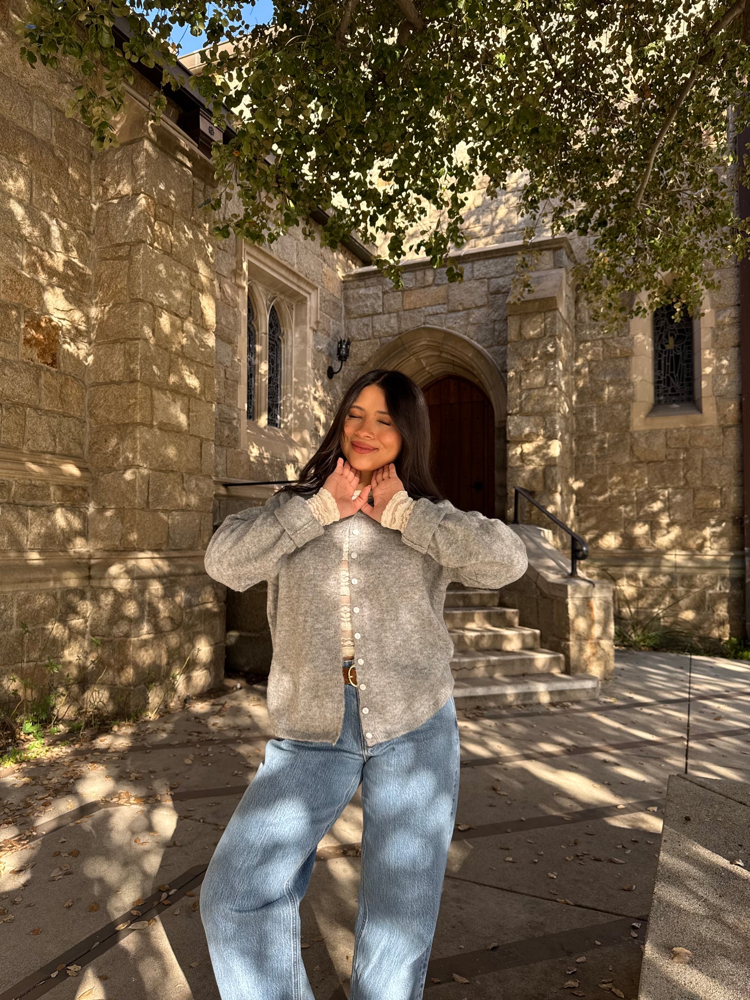 Medium-weight knit cardigan designed with a soft, cozy feel that’s comfortable enough for all-day wear. It features a classic button-down front and a slightly oversized fit that layers beautifully over lace tops, tanks, or tees.