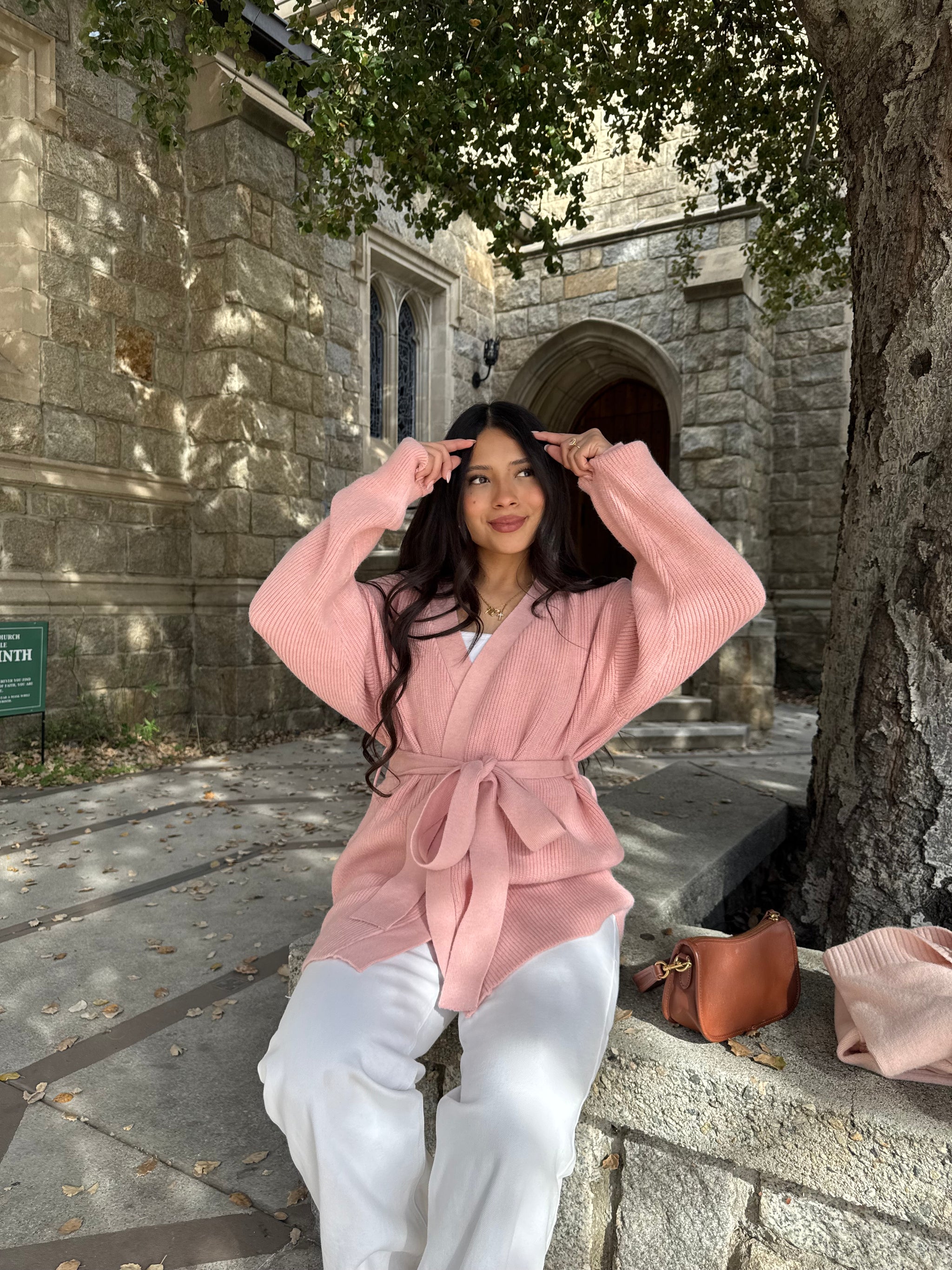 Wrap-style knit cardigan designed with an adjustable waist tie for a flattering silhouette. Finished with long sleeves and a soft ribbed texture for comfortable layering.